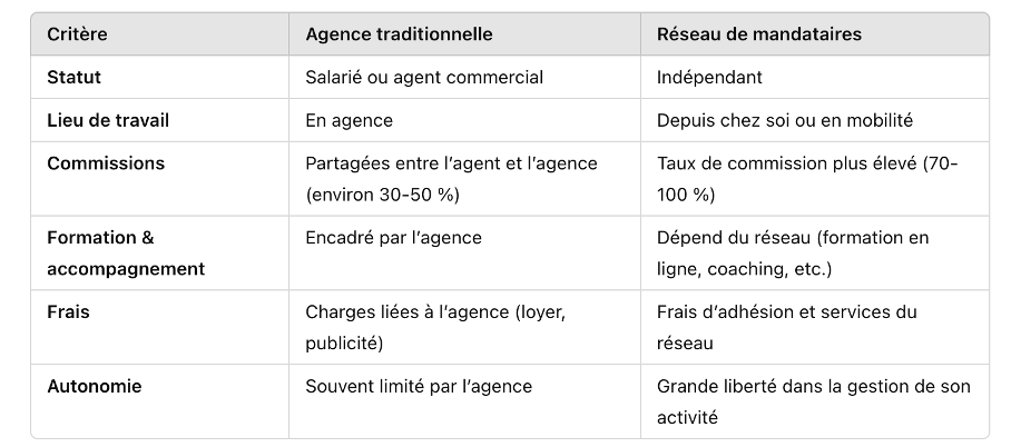Beaucoup d’agents hésitent entre rejoindre une agence immobilière traditionnelle ou opter pour un réseau de mandataires. Voici les principales différences entre ces deux statuts :